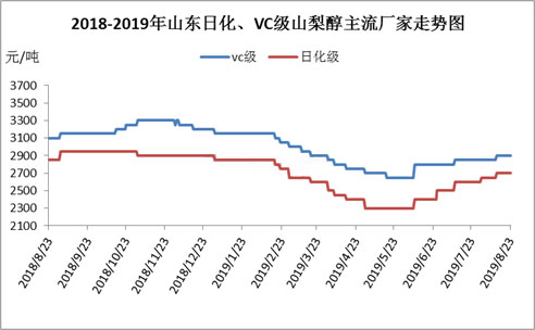 由上圖可以看出8月份山梨醇市場穩(wěn)中偏強運行,廠家報價繼續(xù)被抬升。現(xiàn)從以下幾方面分析山梨醇市場現(xiàn)狀如下:市場供應方面,本月行業(yè)開工相對穩(wěn)定,個別廠家根據(jù)庫存情況窄幅調(diào)節(jié)生產(chǎn),市場貨源穩(wěn)定釋放下渠道內(nèi)貨源供應相對充足。需求方面,中下旬開始,受中秋備貨帶動,下游食品級山梨醇需求好轉(zhuǎn),終端及貿(mào)易商積極備貨,市場走貨量增多,且局部廠家?guī)齑媛燥@緊張;日化級山梨醇未有明顯淡旺季之分,需求相對穩(wěn)定;對于VC級山梨醇,由于目前下游VC廠家停工檢修現(xiàn)象仍存,所以本月VC級山梨醇市場需求向好轉(zhuǎn)變有限,仍略顯疲軟。綜合來看,短期食品級山梨醇需求仍向好維持,對整體市場形成一定支撐。市場價格方面,截止到當前,據(jù)卓創(chuàng)統(tǒng)計,山東市場主流廠家山梨醇食品日化級報價在2700-2750元/噸,VC級報價在2850-2900元/噸,較上月價格繼續(xù)上漲,市場成交商談空間縮小。