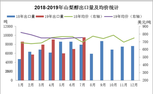 由上圖可以看出2019年7月份山梨醇出口量及出口均價較上月均有增加。據(jù)海關數(shù)據(jù)統(tǒng)計(29054400山梨醇)7月份出口量為9570.74噸,出口金額7216700美元,出口均價754.04美元/噸。2019年7月份出口量環(huán)比上月增幅37.25%,同比去年增幅20.62%,出口均價環(huán)比增幅0.41%,同比增幅8.42%。7月份山梨醇出口需求增加,或?qū)⒁欢ǔ潭染徑鈬鴥?nèi)市場供應壓力,一定程度提振國內(nèi)市場,所以在此利好推動下8月份山梨醇市場繼續(xù)延續(xù)偏強運行態(tài)勢。
